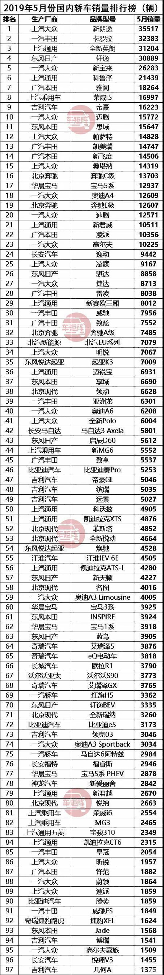 2019年5月份国内轿车销量排行榜