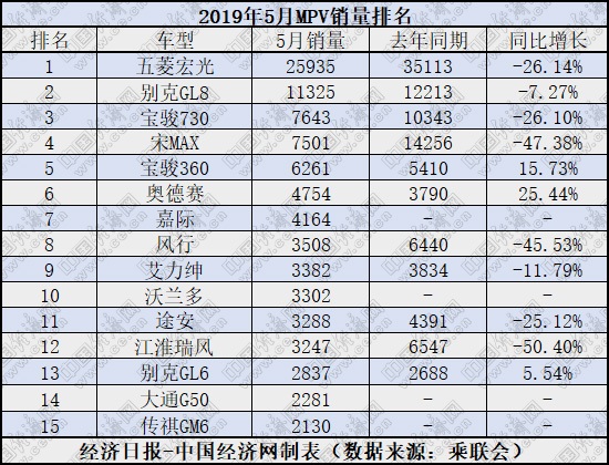 2019年5月份国内MPV销量排行