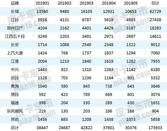 2019年1-5月份国内皮卡销量排行