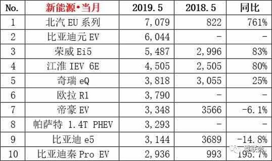 根据乘联会公布的2019年5月份新能源汽车最新销量数据显示,2019年5月,北汽EU系列、比亚迪元EV、荣威Ei5、江淮IEV 6E、奇瑞eQ、欧拉R1、帝豪EV、帕萨特1.4T PHEV、比亚迪e5与比亚迪秦Pro EV位列新能源车销量前十。