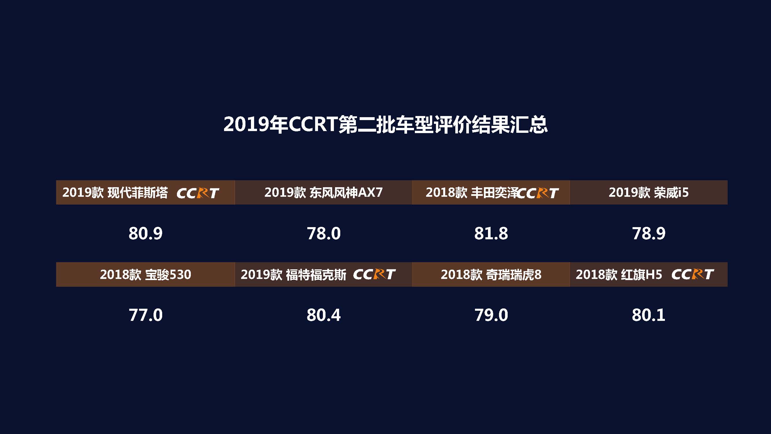 本批次评价涵盖了紧凑型轿车、中大型轿车、小型SUV、紧凑型SUV、中大型SUV五类汽车的8款热门车型,从整体结果看,综合得分80分及以上车型共计4款,成为CCRT2019年度推荐车型,80分以下车型共计4款。各车型具体得分如下: