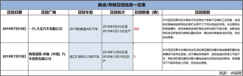 中国网汽车7月19日讯 据国家市场监督管理总局公告,一汽-大众汽车有限公司决定自即日起,召回2018年9月26日至2019年2月13日生产的部分进口2019款奥迪A8L汽车,共计200辆。同时,梅赛德斯-奔驰(中国)汽车销售有限公司自即日起,召回2018年12月6日至2018年12月18日期间生产的部分进口C级和CLS级汽车,共计5辆。