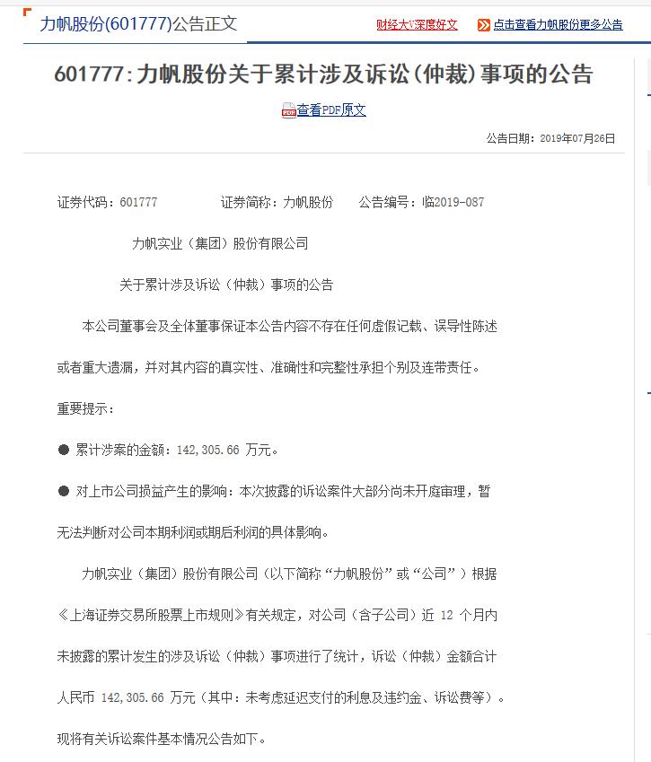 事实上,约607万元的拖欠货款只是力帆汽车众多债务当中的很小一部分,根据力帆股份7月26日的公告显示,近12个月未披露的涉案金额已经达到了14.23亿元,这个数字还不包括延迟支付所产生的利息、违约金、诉讼费等相关费用。