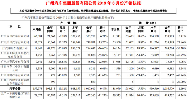 郁俊调离广汽乘用车,与近年来的业绩下滑不无关系。据广汽集团公布的2019年6月产销数据,今年1至6月累计销量999560辆,相比去年同期的1016779辆,同比下跌1.69%。其中,广汽乘用车销量下滑较为明显,其上半年销量186947辆,相比去年同期的268204辆,同比跌幅达到30.3%。