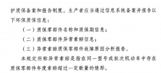 吴青认为,这一条其实是规定了建立机动车生产企业的环保质保备案和报告制度。首先要明确的是其中所称的“质保零部件”究竟所指的是什么,如果没有限定,“质保零部件”的范围很广。其次,“本规定所称异常索赔是指在同一型号或批次机动车中存在质保零部件年度索赔超过一定数量的情形”中的“一定数量”如何解释?这不具可操作性,希望予以明确。