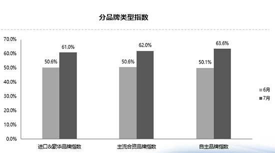 7月,进口&豪华品牌指数、合资品牌指数、自主品牌指数较上月出现超过10%的明显上升,其中自主品牌库存指数高达63.6%。樊宇表示,车市整体表现不理想的时候,各品牌库存预警指数的差异并不明显,而自主品牌的压力更大一些。
