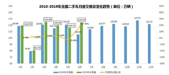 与新车市场相反,二手车市场出现逆势上升。6月,全国二手车市场交易量达到124.44万辆,同比增长17.76%,环比增长7.18%,也是今年同比增速最高的月份;上半年,二手车累计销售686.2万辆,同比增长3.93%。
