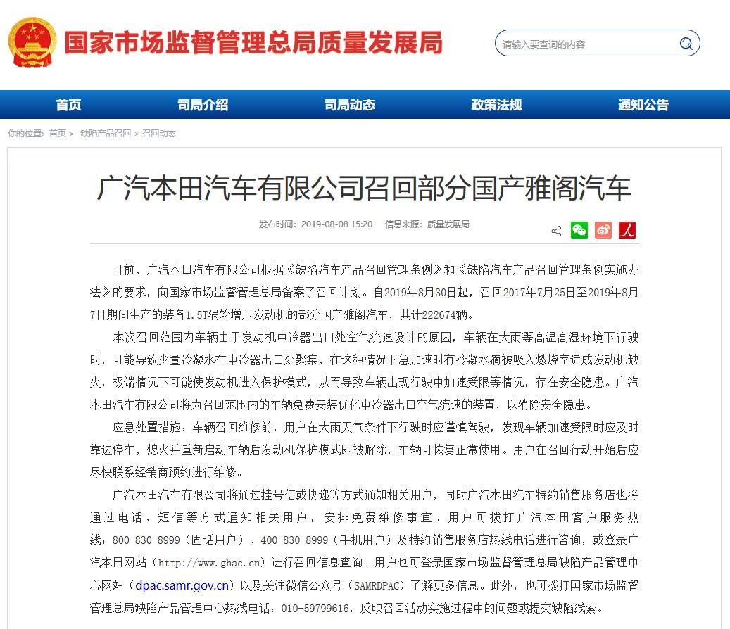 【环球网综合报道】近期大规模爆发的雅阁“失速”问题有了最新进展:广汽本田于2019年8月8日向国家市场监管总局备案主动召回计划,自2019年8月30日骑,召回自2017年7月25日至2019年8月7日期间生产的装备1.5T涡轮增压发动机的部分国产雅阁轿车,共计222674辆。