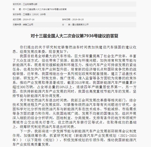 经济日报-中国经济网8月22日讯(记者 郭涛) 日前,工信部发布对《关于研究制定禁售燃油车时间表加快建设汽车强国的建议》的答复。工信部明确指出,将支持有条件的地方和领域开展城市公交出租先行替代、设立燃油汽车禁行区等试点,在取得成功的基础上,统筹研究制定燃油汽车退出时间表。