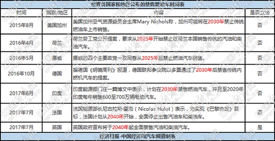 世界各国家和地区公布的禁售燃油车时间表(不完全统计)