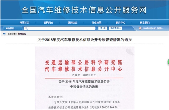 8月16日,交通运输部公路科学研究院汽车维修技术信息公开中心(以下简称公开中心)发布了《关于2018年度汽车维修技术信息公开专项督查情况的通报》(以下简称《通报》),本报独家获取的信息显示,2018年共选取了30家企业共计120个车型进行了实地督查,总体情况比往年有大幅提高,但仍有2家企业的少数车型没有做到位。