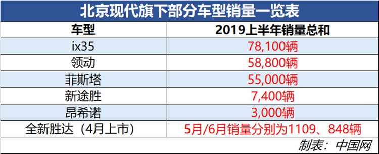 最新的销量数据也印证了这一现象。2019年上半年,北京现代总共实现销售31.94万辆,同比继续下滑15.97%。其中,ix35、领动实现了月均销售过万的“好成绩”,两款车型的上半年销量总和也占据了上半年总销量的42.8%。排在领动、ix35之后的则是菲斯塔,作为北京现代新产品当中表现最好的车型,其上半年累计销量为5.5万,占总销量的17.2%。与之形成强烈反差的是,北京现代昂希诺、全新胜达、全新途胜等新车型却集体“消失”。进一步查询得知, 昂希诺上半年累计仅销售了0.3万辆;4月份上市的全新第四代胜达月销量也就在一千辆左右徘徊。北京现代副总经理文成坤曾在新胜达上市时透露:新胜达今年销量预期是6万辆。残酷的实现是,新胜达的表现大大低于原本官方的预期。