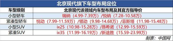 记者梳理后发现,北京现代产品线呈现出“多而不强”的混乱局面。其中,包括悦纳/瑞纳、悦动/领动/菲斯塔、昂希诺/ix25、途胜/ix35等太多重叠车型让消费者无所适从。“产品之间相互‘打架’是常态,源自北京现代产品布局上的犹犹豫豫。” 上述业内人士进一步说道。
