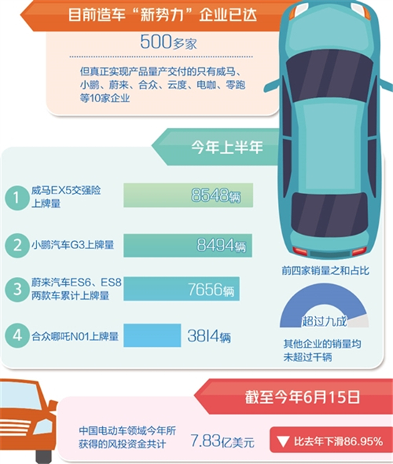 数据显示,今年上半年,威马EX5以交强险上牌量8548辆的成绩,位居第一;小鹏汽车G3上牌量为8494辆,位居第二;蔚来汽车ES6、ES8两款车累计上牌量为7656辆,位居第三;合众哪吒N01上牌量为3814辆,位居第四。前四家销量之和占比超过九成,其他企业的销量均未超过千辆。