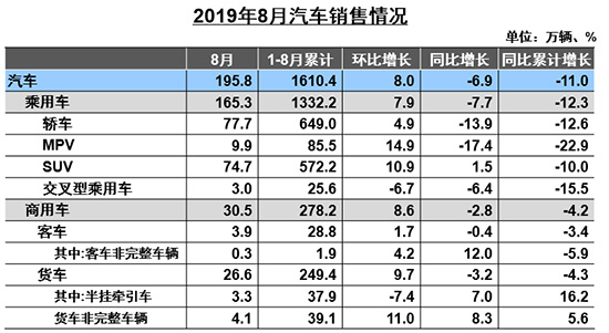 1-8月,乘用车产销分别完成1321万辆和1332.2万辆,产销量同比分别下降13.8%和12.3%。销量降幅比1-7月继续收窄。乘用车四类车型产销情况看:轿车产销比上年同期分别下降12.4%和12.6%;SUV产销比上年同期分别下降13.9%和10.0%;MPV产销比上年同期分别下降23.3%和22.9%;交叉型乘用车产销量比上年同期分别下降10.1%和15.5%。