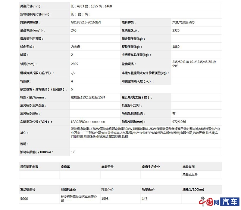 根据申报信息可知,DS9将采用插电式混合动力,动力系统由一台1.6T发动机加电动机组成的插电式混动系统,其中发动机最大功率147kW,驱动电机的额定功率为30kW,最大功率81.2kW,驱动电池为锂离子动力电池。根据工信部消息,新车综合工况下百公里油耗为1.8L。