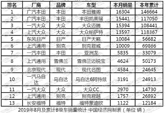 在汽车市场整体下滑的不利局面下,合资B级车保持稳健态势,凸显了企业对“旗舰”车型的重视和市场消费升级的趋势,8月共有六款竞品月销过万辆,同比和环比均呈现小幅增长,实在是难能可贵。但在排行榜“底部”的竞品,以蒙迪欧、名图为代表的车型,始终未能走出困境。