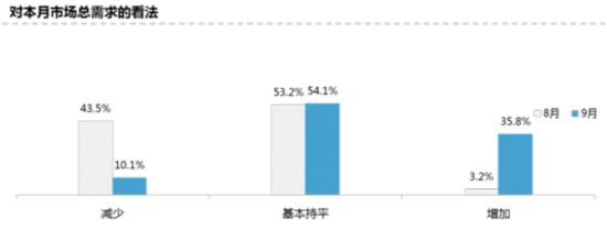 调查显示,9月二手车市场总需求增加。认为市场总需求“增加”的经销商比例为35.8%;“减少”的比例为10.1 %。