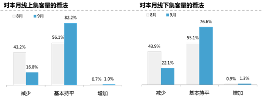 9月,线上集客量减少。其中认为线上集客量“增加”的经销商比例为1.0%,“减少”的比例为16.8%;认为线下集客量“增加”的经销商比例为1.3%,“持平”的比例为76.6%,“减少”的比例为22.1%。