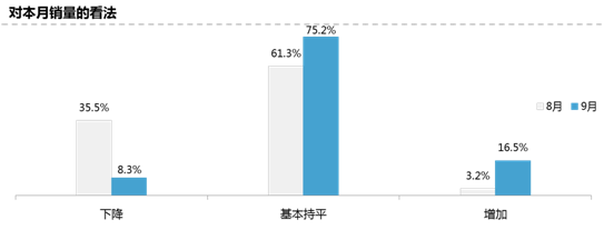 9月,二手车销量有所上升,认为销量“增加”的经销商比例为16.5%;“下降”的比例为8.3%。