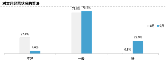 经销商认为9月的经营状况较好,认为“一般”的经销商比例为73.4%,认为经营状况“不好”的比例为4.6%,认为“好”的比例为22.0%。