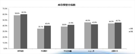 从库存预警分指数来看,9月库存指数60.5%,环比上升1.9个百分点。市场需求指数、平均日销量指数、经营状况指数环比上升、从业人员指数环比下降。樊宇表示,9月最后一周经销商促销力度加大,实现一部分销量上涨,就市场需求和经销商经营状况而言稍有好转。