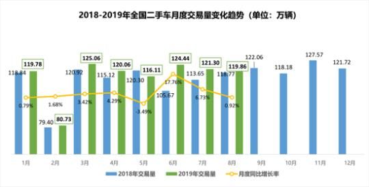 流通协会数据显示,8月,全国二手车市场交易量119.86万辆,环比下降1.19%。1-8月,二手车累计交易927.34万辆,同比增长3.88%,相比上月增幅有所收窄;累计交易金额5880亿元,同比增长5.42%。