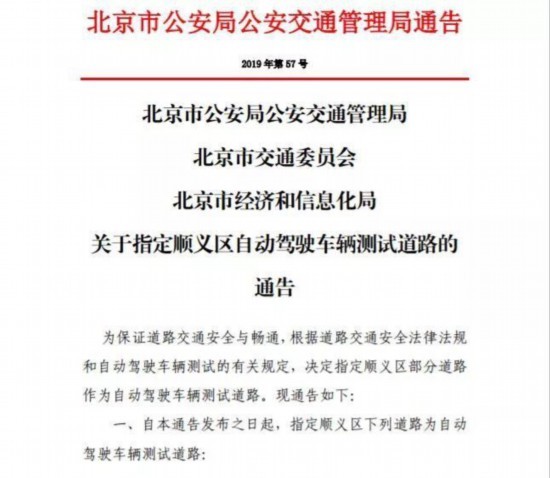 10月11日,北京市公安局公安交通管理局、北京市交通委员会和北京市经济和信息化局联合发布《关于指定顺义区自动驾驶车辆测试道路的通告》。其中规定,北京市顺义区新增26条自动驾驶测试道路;持有测试牌照的自动驾驶车辆每天9时至17时可在指定测试道路上测试。