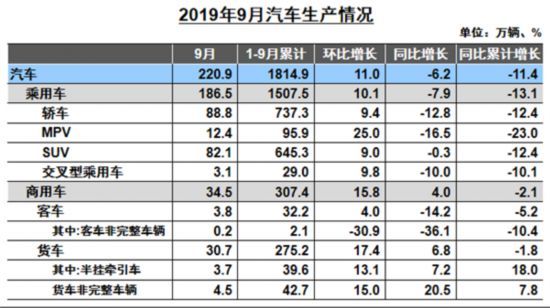 9月,汽车产销量分别完成220.9万辆和227.1万辆,比上年同期分别下降6.2%和5.2%,1-9月,汽车产销分别完成1814.9万辆和1837.1万辆,产销量比上年同期分别下降11.4%和10.3%,产销量降幅比1-8月分别收窄0.7个百分点。