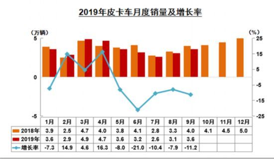 2018年到2019年初,皮卡市场曾出现一段黄金增长期,年初,业内普遍预测皮卡市场将延续去年以来的高增长态势,但实际数据显示,皮卡市场行情不及预期,中汽协数据显示,1-9月,皮卡车产销分别完成32万辆和32.1万辆,产销量比上年同期分别下降6.4%和4.9%,降幅大于货车整体。