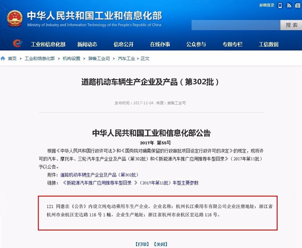 人民网北京12月5日电(王晴)12月4日,工信部公布了第302批《道路机动车辆生产企业及产品公告》,五龙电动车集团旗下子公司杭州长江汽车进入新增车辆生产企业及已准入企业变更信息名单。这是继去年5月获得《国家发展改革委关于杭州长江乘用车有限公司年产5万辆纯电动新能源乘用车项目核准的批复(发改产业[2016]1052号)》后,长江汽车同时获得工信部新能源汽车资质准入,标志着长江汽车正式获得了新能源乘用车生产许可。据长江汽车消息,“双准入”也预示着长江纯电动乘用车板块将在2018年正式启动运营。