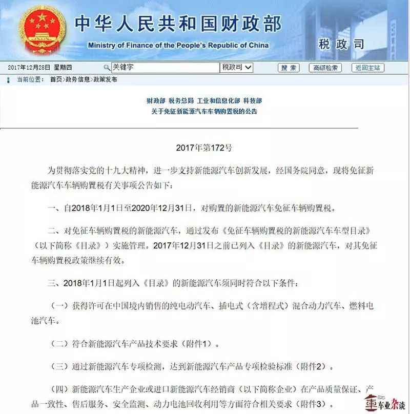 2017年12月27日下午,财政部等四部委发布《关于免征新能源汽车车辆购置税的公告》:自2018年1月1日至2020年12月31日,对(期间)购置的新能源汽车免征车辆购置税。而在2017年12月31日之前已经列入《目录》的新能源车,对其免征车辆购置税的政策将继续有效。