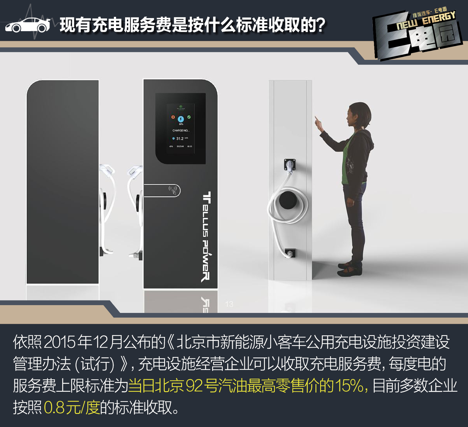 充电设施经营企业可以收取充电服务费,每度电的服务费上限标准为当日北京92号汽油最高零售价的15%,目前多数企业按照0.8元/度的标准收取。