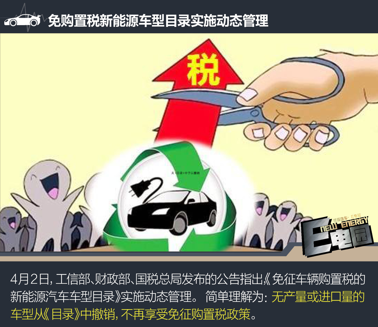 4月2日,工信部、财政部、国税总局发布的公告指出,《免征车辆购置税的新能源汽车车型目录》实施动态管理。
