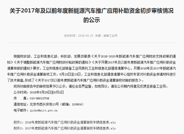 人民网北京5月29日电(王晴)近日,工业和信息化部在其官网上公示了《关于2017年及以前年度新能源汽车推广应用补助资金初步审核情况》。经审核,2016年和2017年新能源汽车企业应清算补贴资金约189.7亿元,同时有69757辆车不符合补贴要求被核减,江淮、北汽、广汽、长城、吉利等企业均有1000辆以上车辆被核减。