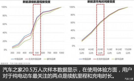 而此前汽车之家调研数据显示,在使用体验方面,用户认为当纯电动乘用车的实际续航里程达到500km时,就可以接受;当实际续航里程达到600km,即可以替代燃油车了。这意味着,在未来两年内,单从续航里程来看,新能源车型或将能够满足大多数消费者的需求。