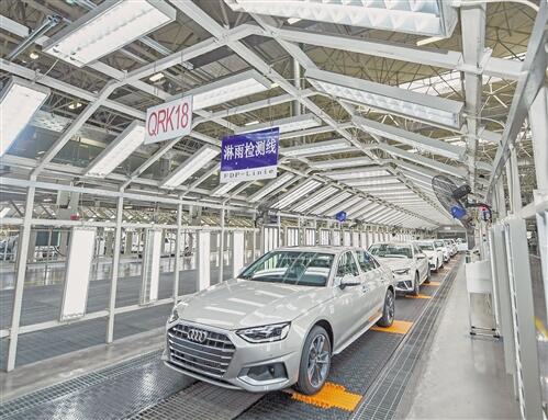 8月10日,在一汽大众长春基地总装车间,装配好的车辆接受淋雨测试。新华社记者 张楠 摄