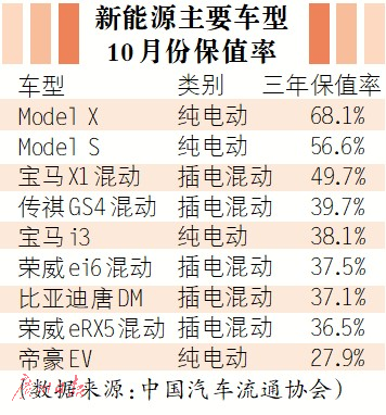 技术先进和成熟的车型保值率较高。如新能源二手车保值率一直居首位的有特斯拉的model X、model S,三年车龄残值依然可有五六成,Model X75D甚至高达68.1%,媲美传统燃油车。此外,三年残值较高的新能源汽车基本产自传统车企,宝马X1混动、i3,广汽传祺GS4插电混动、荣威ei6插电混动、比亚迪唐DM等都在保值率前十。