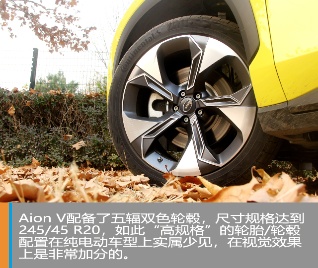 车身侧面设计更是充分利用粗线条构建起设计的整体性,自前大灯贯穿至D柱的镀铬饰条极具视觉冲击力,相比之下腰线与裙部折线要柔和了很多,也让侧身的视觉重心明显上提增强了厚重感。尾灯也进行了向前的额外延伸,与后门把手相融合,这样的设计细节在其它车型上并不多见,配合门把手的隐藏式设计,让侧面的科技感与辨识度大大增强。隐藏式门把手会在用户靠近车辆时自动弹出,而在下车后远离车辆时又会自动锁车收闭,满满的仪式感让人颇为受用。Aion V配备了五辐双色轮毂,尺寸规格达到245/45 R20,如此“高规格”的轮胎/轮毂配置在纯电动车型上实属少见,在视觉效果上是非常加分的。