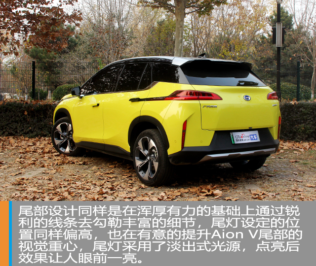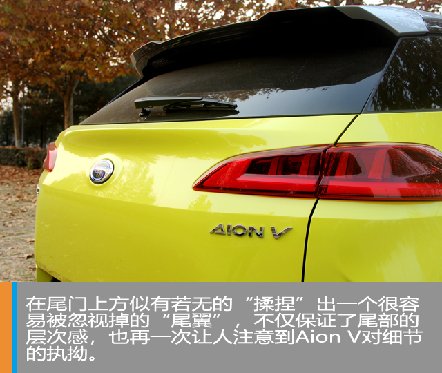 尾部设计同样是在浑厚有力的基础上通过锐利的线条去勾勒丰富的细节,尾灯设定的位置同样偏高,也在有意的提升Aion V尾部的视觉重心,尾灯采用了淡出式光源,点亮后效果让人眼前一亮。在尾门上方似有若无的“揉捏”出一个很容易被忽视掉的“尾翼”,不仅保证了尾部的层次感,也再一次让人注意到Aion V对细节的执拗。
