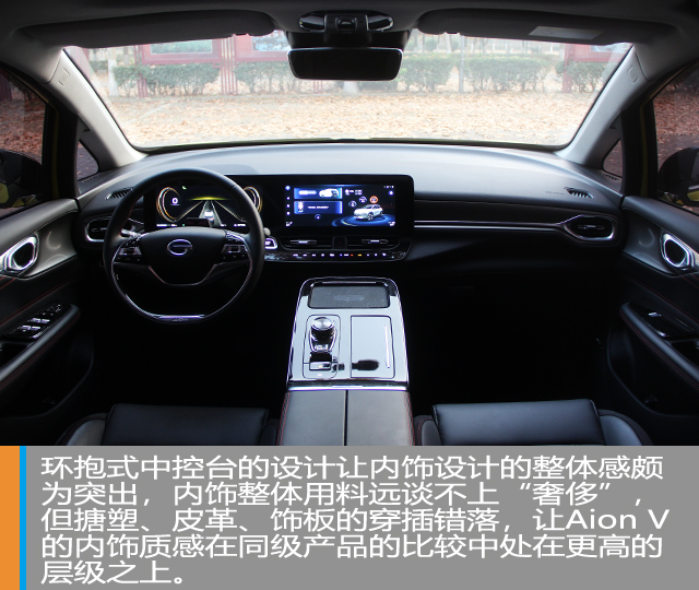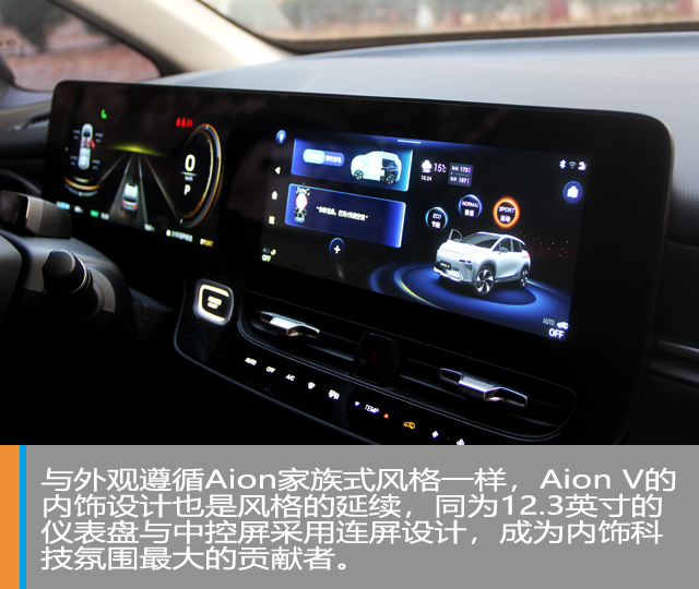 与外观设计遵循Aion家族式风格一样,Aion V的内饰设计也是风格的延续,同为12.3英寸的仪表盘与中控屏采用连屏设计,成为内饰科技氛围最大的贡献者。环抱式中控台的设计让内饰设计的整体感颇为突出,内饰整体用料远谈不上“奢侈”,但搪塑、皮革、饰板的穿插错落,让Aion V的内饰质感在同级产品的比较中处在更高的层级之上。