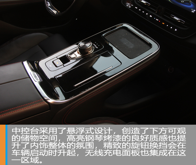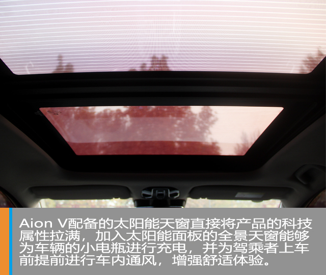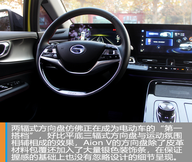 两辐式方向盘仿佛正在成为电动车的“第一搭档”,好比平底三辐式方向盘与运动氛围相辅相成的效果,Aion V的方向盘除了皮革材料包覆还加入了大量银色装饰条,在保证握感的基础上也没有忽略设计的细节呈现。转向柱上的传感器用于检测驾驶者状态,会在自适应巡航时以及日常驾驶过程中,实时语音提示驾驶者集中精力安全驾驶,让驾驶者对Aion V的科技属性有了非常直观的体验。中控台采用了悬浮式设计,创造了下方可观的储物空间,高亮钢琴烤漆的良好质感也提升了内饰整体的氛围,精致的旋钮换挡会在车辆启动时升起,无线充电面板也集成在这一区域。但中控台的宽度过宽,对驾乘者腿部侧向空间形成了一定的负面影响,也是无法回避的客观问题。Aion V配备的太阳能天窗直接将产品的科技属性拉满,加入太阳能面板的全景天窗能够为车辆的小电瓶进行充电,并为驾乘者上车前提前进行车内通风,增强舒适体验。