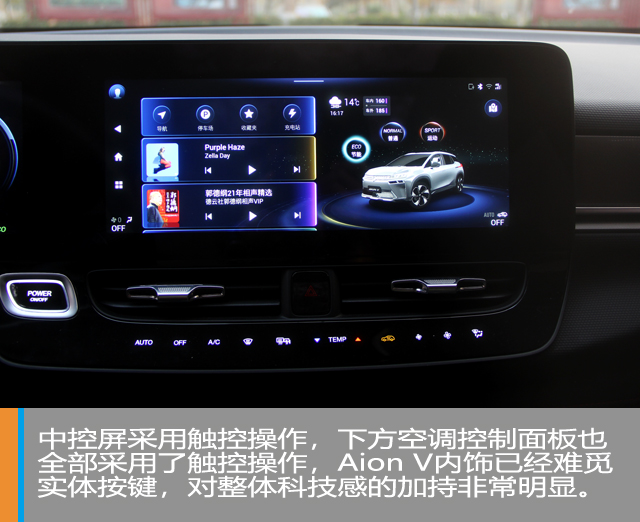 液晶仪表盘充分体现了高清晰度的优势,四种显示模式视觉上都颇具未来感,Aion V车型配备的AR实景导航功能也呈现在仪表盘上。中控屏采用触控操作,下方空调控制面板也全部采用了触控操作,Aion V内饰已经难觅实体按键,对整体科技感的加持非常明显。中控屏集成度很高,ADiGO智能物联系统提供了丰富的车机资源,包括QQ音乐、高德地图、无线CarPlay、AI智能语音控制功能等等,但车机操作的逻辑性虽然清晰,但操作过程略显繁琐,选择某些功能或设定部分车辆参数时需要几级页面展开后才能完成操作,或许需要驾驶者频繁使用语言控制功能以保证驾驶时的安全。