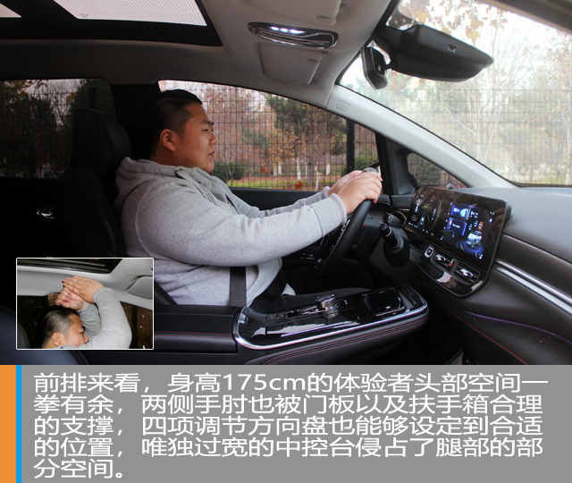 前排来看,身高175cm的体验者头部空间一拳有余,两侧手肘也被门板以及扶手箱合理的支撑,四项调节方向盘也能够设定到合适的位置,唯独过宽的中控台侵占了腿部的部分空间。