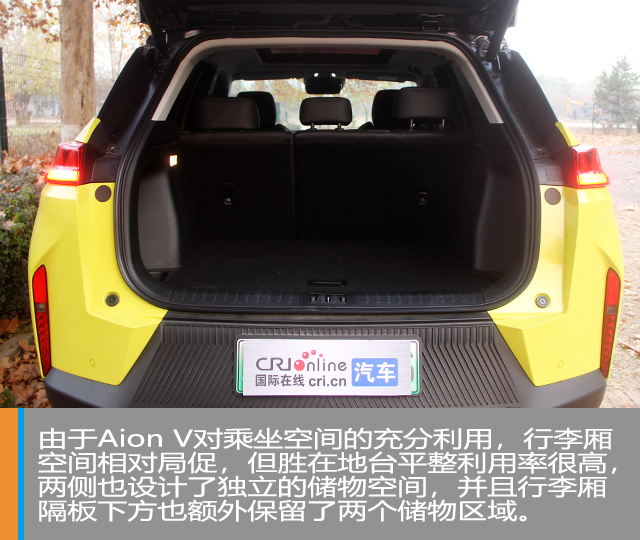 由于Aion V对乘坐空间的充分利用,行李厢空间相对局促,但胜在地台平整利用率很高,两侧也设计了独立的储物空间,并且行李厢隔板下方也额外保留了两个储物区域。后排座椅可以4/6比例放倒,在应对相对极端的储物需求时也有一战之力。