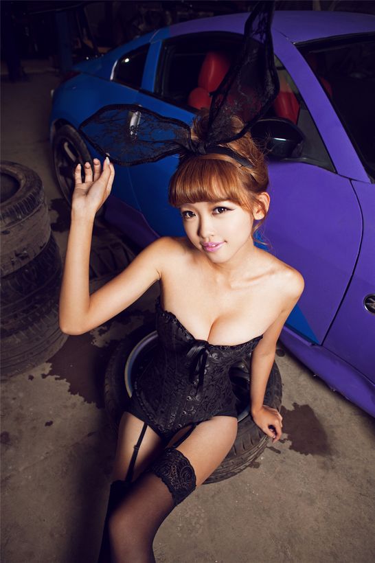 深夜,冰冷的改装车间显得尤为安静。性感的兔女郎望着杂乱的工具、改装部件,回忆起一天的忙碌,人来人往过后只剩下孤独。本组型车魅影拍摄所选用的模特为外表娇甜可人的曾莹,其身着极具诱惑力的兔女郎装扮,微微凸显的傲乳、性感的黑色丝袜,诱惑之处无一不让异性们为之倾倒。车辆方面,由北京转速动力打造的日产350Z飘移赛车,紫蓝色的车身涂装设计十分醒目,硕大的碳纤维尾翼暗示出它不凡的性能表现。轮毂选用了ASUKA品牌的赛车系列,简约的单五幅设计配上古铜色涂装,为这台350Z的外观更是增添了不少赛车气息。