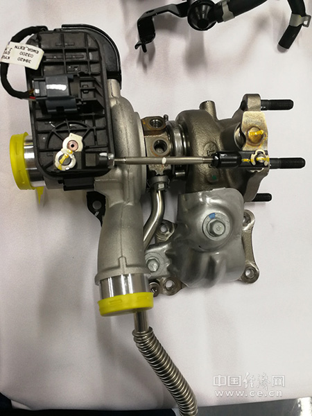 Kappa 1.4T发动机采用了EWGA涡轮增压器。作为这款发动机的核心部件之一,EWGA涡轮增压器采用了电子泄压阀,可以实现汽缸压力的精准控制,确保汽缸在工作状态下始终保持最佳工况,并可有效增大进气量,确保发动机的最大功率与扭矩可提升约40%以上(张羽摄)。
