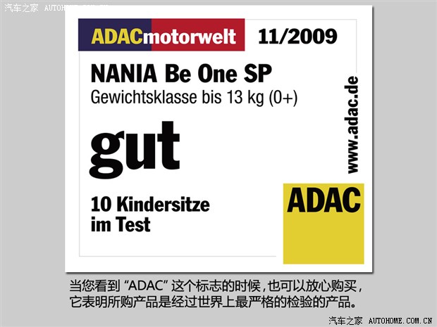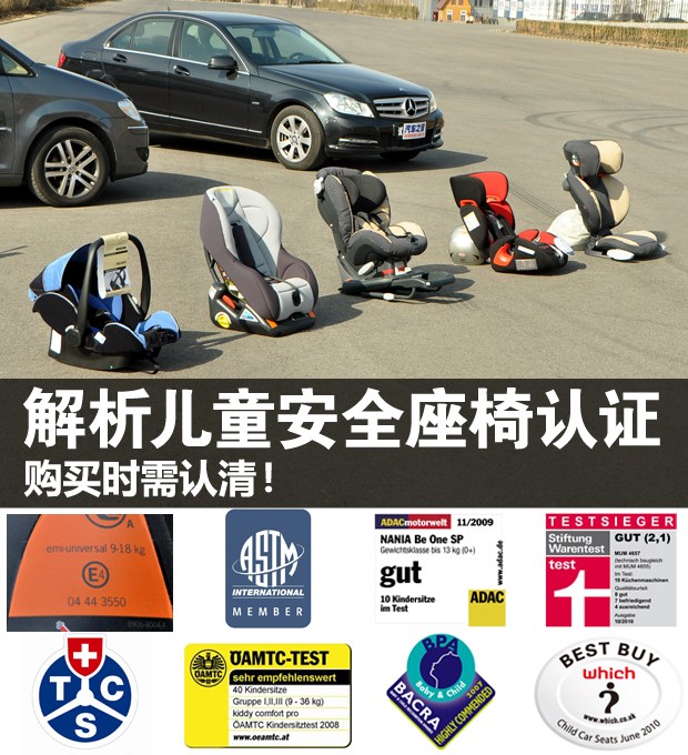 当你在一款产品上看到“ADAC”的标识,则表明这款产品是经过德国ADAC全德汽车俱乐部认证的,在欧洲许多国家,如西班牙、瑞士、芬兰以及奥地利都设有俱乐部,大部分在欧洲拥有汽车的人士都会加入ADAC成为其会员。ADAC的碰撞试验采用70km/h的速度进行测试(ECE碰撞试验采用50km/h的速度进行测试),比ECE R-44/04的考验还要严峻,有声音称ADAC是世界上最为严格的认证标准。