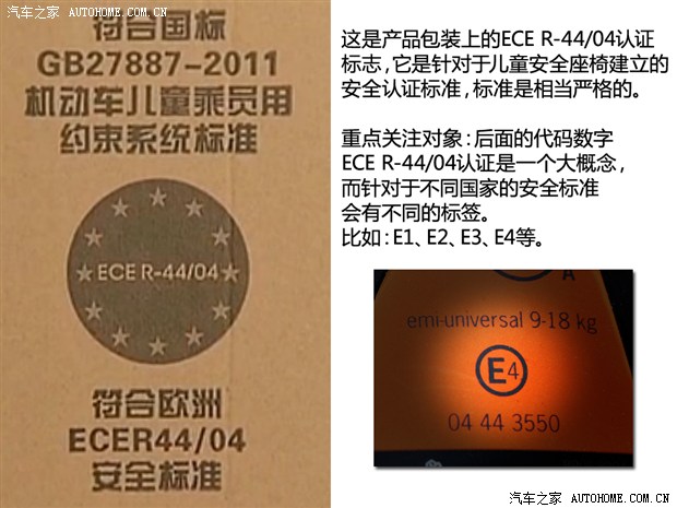 这里是需要重点介绍的内容!ECE R-44/04认证标准并不是全部一样的,千万不要以为有了这个标识就是能走遍天下质量标准了,它是一个大概念,而针对于不同国家的安全标准会有不同的标签,这里的关键词是“标准”,直白地说就是不同国家对于安全座椅安全指数的要求和标准是不一样的。