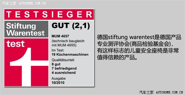 1964年,德国联邦议院建立了这个最有影响力的消费者产品测试协会。该协会的主要目标是通过测试比较各品牌的产品性能及售后服务,为消费者提供独立、客观的评价。为保证公正性,该协会每年会从市场上购买一定数量各品牌当年新上市的产品,然后进行测试。因此,它也是目前欧洲存续时间较长且最有公信力的组织,有这样标识的儿童安全座椅是非常值得信赖的产品。